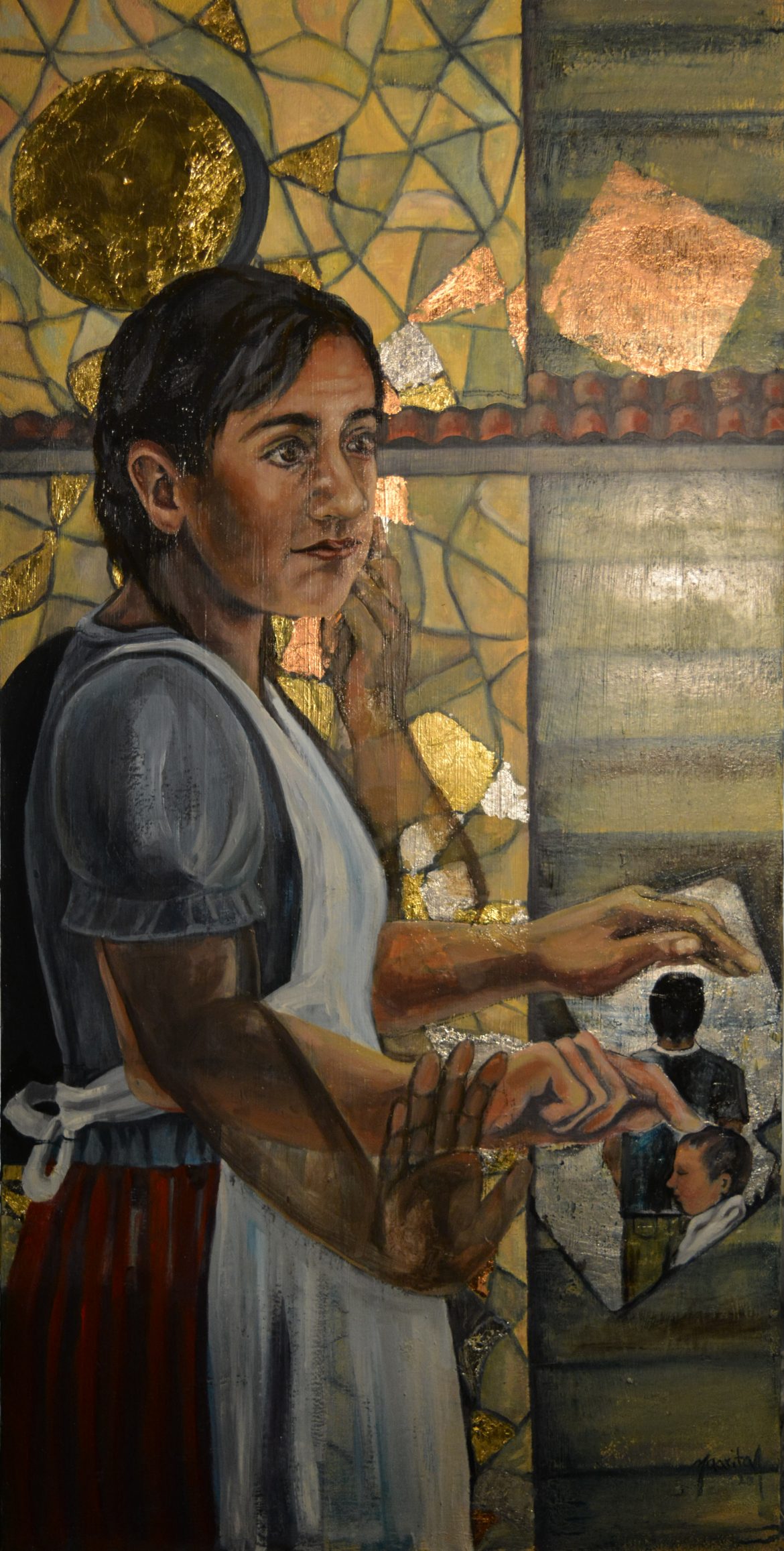 Finalmente, en la pintura del retrato realizado, se ha explotado el uso del del pan de oro, plata y bronce; cuyo significado e iluminación abren una nueva ventana al entendimiento. Dichos materiales permiten que el cuadro refleje la luz que lo rodea. Sin embargo, la impresión que el reflejo genera es como iluminación propia; ya que el material potencia cada destello de luz. De esta manera captura al observador generando distintas percepciones lumínicas de acuerdo a la variabilidad del ambiente y la luz que rodea a la obra.