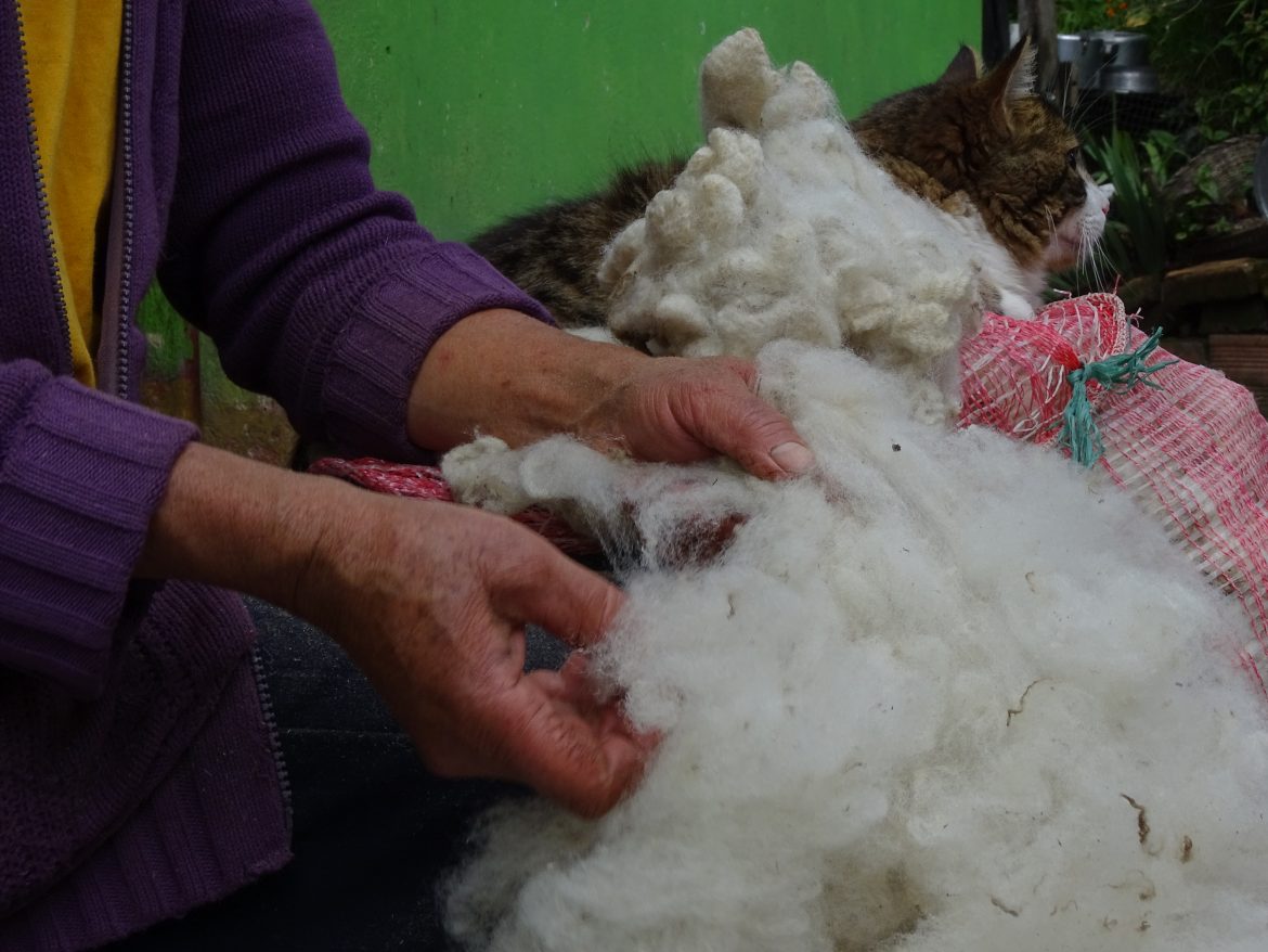 Sus fieles acompañantes pimienta, rocket y mateo, sus nietos Samuel y Estefanía compañeros itinerantes, mantienen un vínculo muy sólido con Rosa, ella también le enseña a su nieta de 10 años a hilar: un palo como huso y una papa de tortero, (todo se utiliza nada se desecha el valor de los objetos-reutilizar), así tres generaciones unidas a un hilo de diálogos extensos. Mientras hilábamos que generalmente lo hacíamos en horas de la mañana, las onces no faltaban una costumbre de los hogares rurales, en días fríos agua de panela con hierbas de la huerta y de vez en cuando un envuelto, o los almuerzos de habas verdes. En cada encuentro la trama se hace más fuerte, crecen las palabras-significados y su memoria al igual que la mía se van uniendo en el hilo.