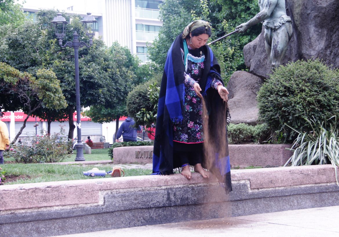 Luego de esto de estar parada haciendo sonar mis instrumentos que son usados tanto en lo ceremonial como festivo, saco del bolsillo de mi delantal, tierra, varios puñados los tiro lentamente en el cemento y luego con un jarro de madera chorreo lentamente agua, en la tierra como en el cemento, es fundamental el uso del elemento agua como elemento vital pero también en este caso por su capacidad purificadora, renovadora, de descarga de fuerza para limpiar los espacios , considero que hacer caer el agua en el cemento donde antes tiré la tierra y por lo cual se formó un poco de barro constituye un simbolismo de hacer visible todo eso esencial que se nos olvida , el territorio mismo , el paisaje , lo que nos sostiene y nutre y que también hoy es la causa que nos mueve a nosotros como mapuche, se gente de la tierra literalmente, sentir y llevar nuestro origen en el lugar que pisemos. Seguidamente me paro sobre este barro, coloco mis pies descalzos y doy un giro en 180° hacia la izquierda, contrario al sentido del reloj, para mi cultura esa dirección es contraria a como gira la tierra, por lo tanto, es para sacar, extraer, revertir, luego salgo del lugar y mis pies dejan sus huellas barrosas mientras me desplazo, finalizando mi intervención.